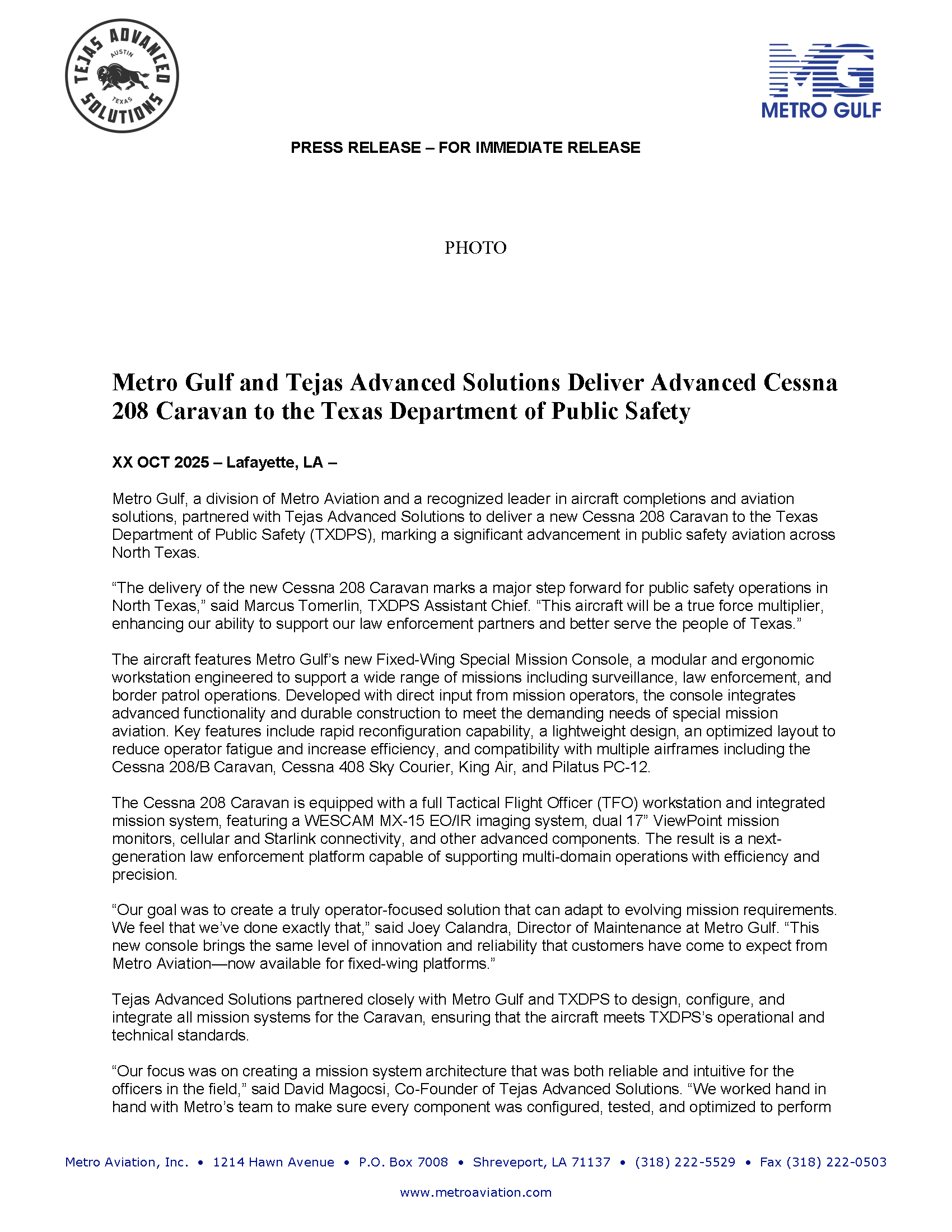 Press Release: Metro Gulf and Tejas Advanced Solutions Deliver Advanced Cessna 208 Caravan to the Texas Department of Public Safety Oct 25 Written By Tejas Advanced Solutions LLC Tejas Advanced Solutions LLC